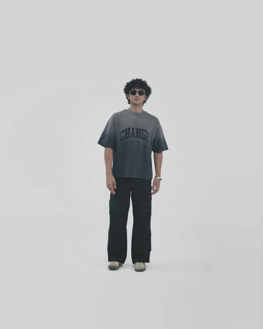 Introducing the Pencil Black Boxy T-Shirt in a refined deep-black tone, cut to a relaxed boxy fit from medium-weight cotton with a smooth, comfortable hand feel. Treated with a PP wash to achieve a subtle vintage depth, the piece features tonal Change typography applied through a water-print technique, blending into the surface for a clean, understated look. The neckline is structured and closely shaped, maintaining balance between comfort and precision. Finished with premium alignment in every seam and stitch.
