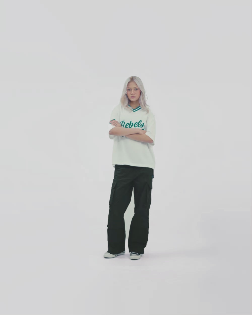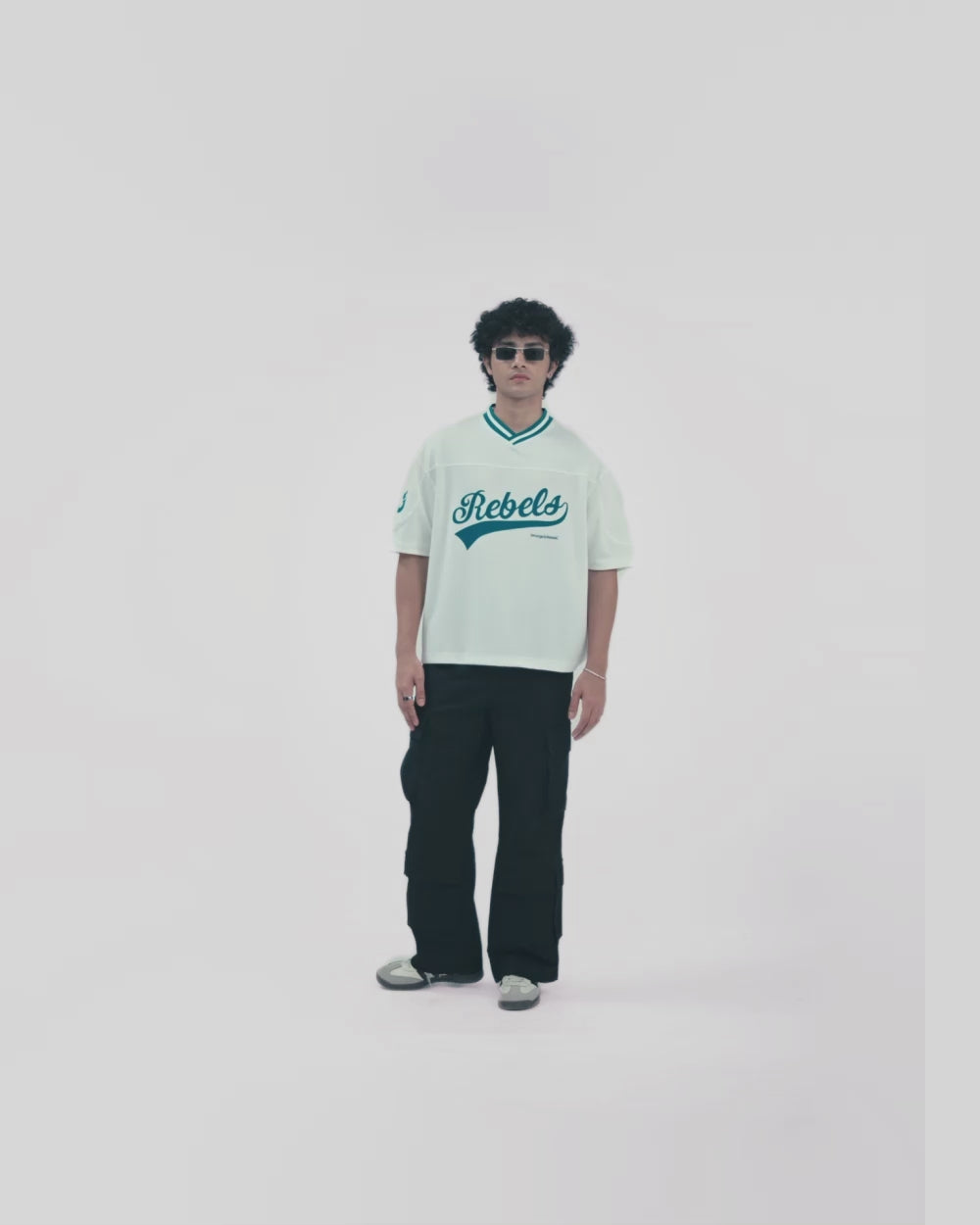 Introducing the Rebels Jersey in an almost cream-white tone, crafted from premium polyester for a lightweight, athletic feel. Designed with a relaxed boxy fit and a classic V-neckline, the piece draws inspiration from vintage sportswear while keeping a refined Wrongs and Rebels edge. The front features a tonal Rebels water print, complemented by a bold 03 on the sleeve, a nod to our third collection. Contrasted with subtle vintage green detailing, the jersey blends versatility, comfort, and statement style in one.